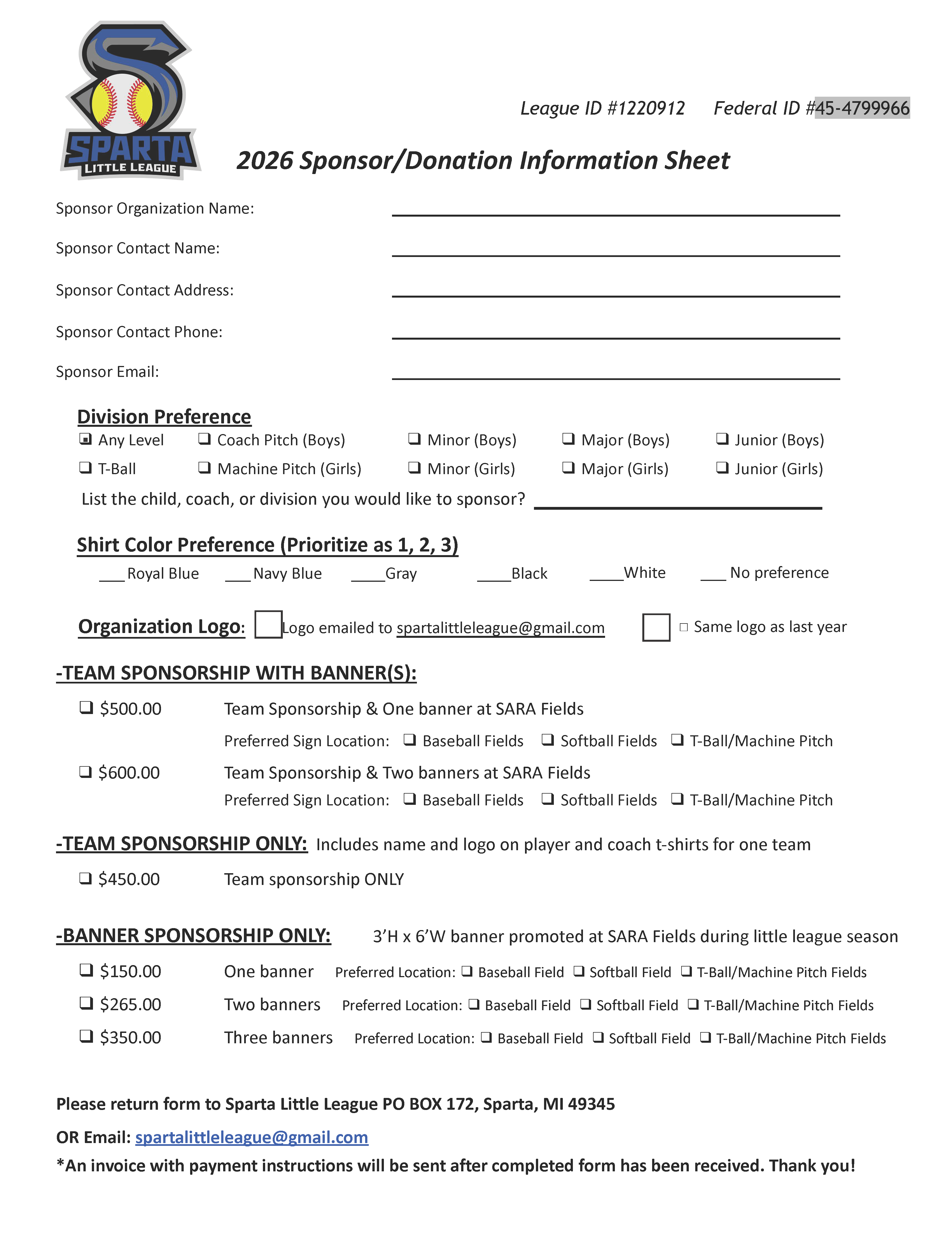 Sparta Little League operates in part by the generosity of its sponsors. Sponsors allow Sparta Little League to offer a low cost, high quality baseball and softball experience. If you are interested in sponsoring Sparta Little League, please download the